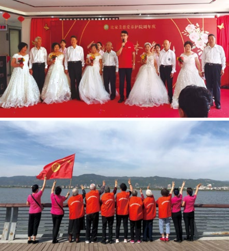 太原市比家美养老院(以下简称“比家美”)创立于1999年,是太原市第一家专门接收失能失智老人的民办养老院,至今已运营25年,有两家机构、一家社区养老服务中心,总床位500张,目前入住率达75%,其中社区养老服务中心还承接社区养老服务及居家上门服务,做到机构、社区、居家养老模式全覆盖。随着我国经济社会发展和人民生活水平的不断提高,人民群众对于精神文化的需求愈加强烈。老龄化进程的不断加快,使越来越多的老年人渴求得到高质量的文化娱乐生活。提供集中住养服务的养老院,也从20世纪90年代初对衣食住行的需求逐渐走向对精神文化娱乐的需求。如何顺应时代发展,立足于“为了老人一切、一切为了老人、为了一切老人”的服务理念,满足日益显著的文化娱乐需求,实现入住老人归属感、幸福感、获得感的提升,是新时代养老人的新使命。比家美在文化娱乐服务中,花心思、下功夫,聘请专职社工、心理咨询师讨论制定契合入住长者身体状况及心理需求的文娱活动,调动老人积极性、参与性,从而消除老年人常见的孤独、抑郁、焦虑的心理情绪,使其心情愉悦,从而提高生活质量,实现生活照料、文娱服务的良性循环。在日常文娱生活中,上午比家美的社工会根据康复治疗师的专业建议,与其配合带领老人进行康复训练。原本单一乏味的重复性康复动作,在社工结合音乐疗法后变成了生动有趣的韵律操,枯燥的伸腿、抬脚动作随着音乐的节奏变得欢快起来,在一首加一首的串烧曲目下,从肩颈、上肢、腰胯、腿部每一个康复部位全部活动到位,老人们被带动着全部完成。即使遇到坐轮椅的老人无法自主完成腿部运动的情况,康复师也会帮助老人被动锻炼,在达到康复目的的同时也消除了老人们“丧失腿部”的失落感、沮丧感。下午,比家美的社工为老人安排了趣味手工、视频排演、大合唱、电影节等丰富且不重样的一周活动。3点半的活动时间很多老人为了占据前排位置,都早早就往活动室赶,俨然一副大学抢占自习室的感觉。尤其受老人欢迎的是专为老人开设的视频账号,里面所有的视频都是比家美老人参演后期编辑形成的。这些视频我们一方面投放到网络,让家属及更多的人看到;另一方面整理成文档,在每周的电影播放日为老人播放。比家美社工专门做了统计,同样是看电影的时间,看普通影视作品,老人们的注意力集中时间平均为40分钟,但是看自己拍摄的视频,往往是看到1小时以上还不想结束。自己的样子声音真真实实地出现在荧幕上,极大提升了老年人的成就感、荣誉感、获得感,从而更加调动了其参加活动的积极性,形成良性循环。偶尔有子女接其回家住,老人还因为怕耽误拍摄,不愿意多住,这也说明了入住老人与养老院之间的黏合度,从而降低离院率。除了日常的文娱活动外,比家美还会组织一些特别的纪念活动、新奇的体验活动,以及游学活动。2020年,比家美为在院的五对老人举办了盛大的金婚盛典。从婚纱选购、跟妆安排、照片拍摄、典礼现场都由工作人员一一安排妥当,省市各大媒体全程拍摄报道。在50年婚龄的金婚盛典上,平均年龄80岁的夫妻携手上场,穿着洁白婚纱的奶奶们面色娇羞,甚是可爱。在场报道的记者激动不已,他们看了太多年轻的新人为爱承诺,却很少见到这样用50年守护践行爱的场面。一位位耄耋绅士对着自己的伴侣深情说出的“我爱你”,带着风雨兼程的不易,带着守得云开见月明的喜悦,他们站在所有人的羡慕里。“比翼双飞五十载,家庭幸福享天伦,美满伴侣永相伴。”我们为老人献上了带有“比家美”藏头诗的特制婚书及婚戒,为这场盛典留下了动人的纪念。老人的子女们更是把有关的新闻报道发给亲朋好友。一场精心准备的活动、一个圆了老人婚纱梦的盛典、一篇老人心理关爱报道、一段广为流传的佳话,丰富了老人的精神世界,提升了老人的幸福感,增添了老人对生活的期待,获得了家属及社会各界的赞扬,打造了比家美养老品牌的知名度。
