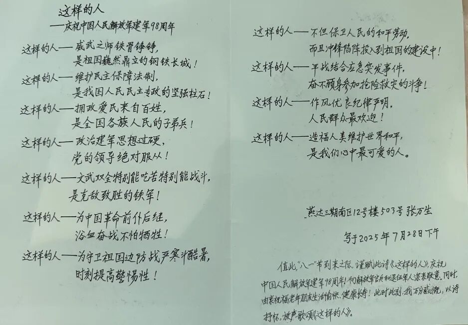 在活动现场,燕达在住长辈张万生以诗抒怀,朗诵了他自己创作的一首诗《这样的人》。他说:“在八一建军节到来之际,我感慨万分地写了这首诗,既是为了庆祝中国人民解放军建军98周年,向解放军官兵和退伍军人深表敬意,同时也由衷祝福老年朋友生活愉快、健康长寿!”