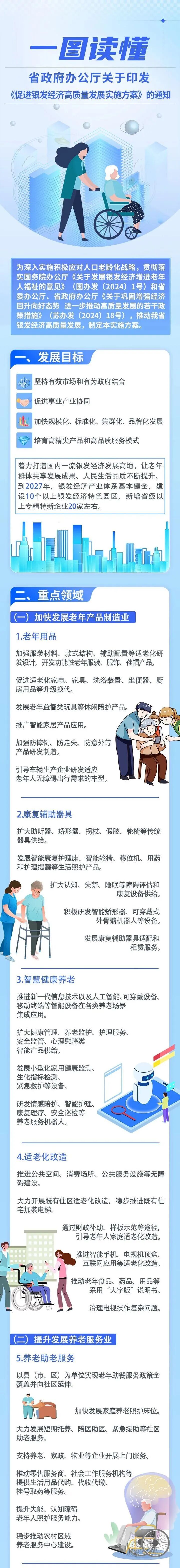 为深入实施积极应对人口老龄化战略,推动江苏银发经济高质量发展,近日,我省印发《促进银发经济高质量发展实施方案》(以下简称《实施方案》)。一是发展目标,《实施方案》提出,到2027年,银发经济产业体系基本健全,建设10个以上银发经济特色园区,新增省级以上专精特新企业20家左右。二是重点领域,《实施方案》明确,加快发展老年产品制造业、提升发展养老服务业、培育发展抗衰老产业3个重点领域,细化10个重点发展方向。三是具体行动,《实施方案》围绕产业强链补链、产业主体壮大、产业园区培育、知名品牌示范、适老产品推广、银发消费促进等6个方面,明确重点任务。四是政策措施,《实施方案》提出,支持重点项目建设、加强科技创新应用、加大财政金融支持、保障用地用房需求、完善医保支付政策、推进人才队伍建设、健全数据要素支撑、优化市场环境8个方面支持政策。