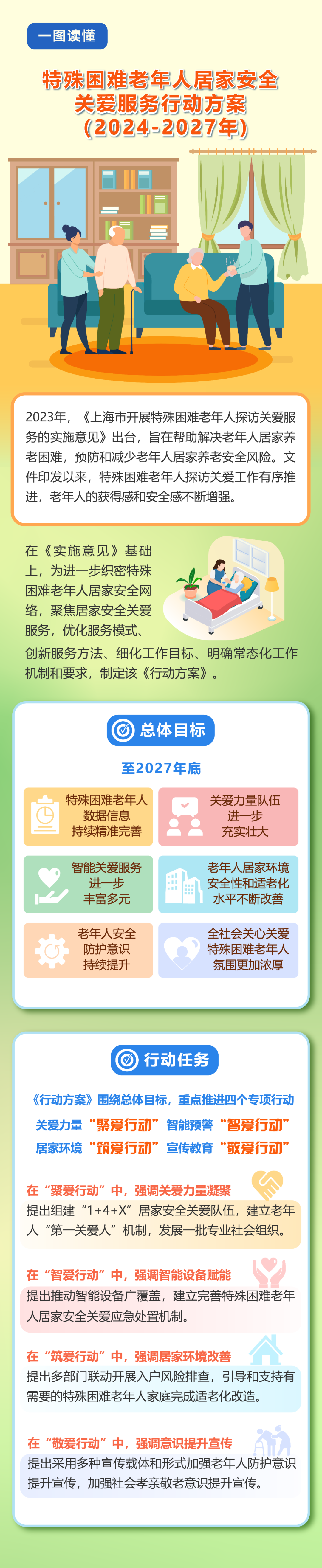 为贯彻落实《关于开展特殊困难老年人探访关爱服务的指导意见》(民发〔2022〕73号)《上海市开展特殊困难老年人探访关爱服务的实施意见》(沪民养老发〔2023〕7号),推进开展特殊困难老年人居家安全关爱服务,结合本市实际,制定本行动方案。聚焦特殊困难老年人居家安全,以筑牢安全底线为基本原则,以营造全社会共同关心关爱特殊困难老年人的良好氛围为发展方向,切实提升居家安全关爱服务水平。至2027年底,特殊困难老年人数据信息持续精准完善,关爱力量队伍进一步充实壮大,智能关爱服务进一步丰富多元,老年人居家环境安全性和适老化水平不断改善,老年人安全防护意识持续提升,全社会关心关爱特殊困难老年人氛围更加浓厚。围绕总体目标,重点推进关爱力量“聚爱行动”、智能预警“智爱行动”、居家环境“筑爱行动”、宣传教育“敬爱行动”等四项行动。1.组建“1+4+X”居家安全关爱队伍。各区民政局会同相关部门指导各街镇、居(村)委组建居家安全关爱队伍,“1”即指:街镇、居(村)委有专人负责;“4”即指:重点将“老伙伴”志愿者、楼组长、物业人员、社区党员志愿者发展成为核心关爱力量;“X”即指:积极吸纳老年协会、养老护理员、计划生育特殊家庭扶助关怀志愿者、助残志愿服务者、社会救助工作人员、学生志愿者、为老助餐员、送奶员、物流快递人员等多元关爱力量。各区民政局加强力量统筹和关爱分工,确保关爱力量与老年人有序对接,避免出现服务遗漏和服务重复的现象,最大化发挥关爱力量服务效能。至2025年底,全市关爱力量达到5万人;至2027年底,全市关爱力量达到5.5万人。2.建立老年人“第一关爱人”机制。老年人的子女是第一关爱人,各区民政局要指导街镇、居(村)委,加强与老年人子女的联系,并督促其子女履行法定赡养义务、承担老年人居家安全关爱保障第一责任;对无子女且无共同居住生活人员的特殊困难老年人,各区民政局要指导街镇、居(村)委将老年人的监护人列为第一关爱人或依法担任监护人。3.发展一批专业社会组织。鼓励各区民政局积极利用公益慈善、为老服务等领域的社会组织,结合其自身优势提供老年人居家安全关爱服务,在关爱力量招募、资源整合、服务方案规划和服务实施等方面充分发挥专业性作用。鼓励各区民政局通过发挥各类慈善组织作用、募集社会资金、协调财政资金等方式,为社会组织给予资金支持。至2027年,全市选树一批优秀社会组织典型,加大宣传激励。1.推动智能设备广覆盖。提高智能关爱水平,通过推进应急呼叫装置、智能水表、智能电表、智能门磁、燃气报警器、智能床垫、家庭摄像头等设备安装,强化智能预警关爱。至2025年底,特殊困难老年人应急呼叫服务全覆盖。至2027年底,特殊困难老年人家庭安装智能水表“愿装尽装”,总体安装率不低于60%。2.完善应急处置机制。各区民政局应会同相关部门建立完善特殊困难老年人居家安全关爱应急处置机制。鼓励各区依托各级城运中心应急处置机制,强化“老人安全预警工单受理—派单应对处置—服务完结跟踪”的全流程闭环;对于依托城运中心实现闭环处置条件尚未成熟的区,支持其自建居家安全关爱服务系统,实现关爱应急处置闭环。1.推进家庭风险隐患预防化解。各区民政局指导街镇、居(村)委加强与物业、住建、燃气、消防、电力等部门的工作联动,常态化开展联合入户排查行动,提醒子女等亲属关注老年人居家环境风险隐患排查,全力帮助特殊困难老年人化解房屋安全、设施安全、用气安全、消防安全、用电安全等风险隐患。2.加大居家环境适老化改造力度。各区民政局指导街镇、居(村)委面向特殊困难老年人加大居家环境适老化改造需求排摸,加大政策宣传力度,引导和支持有需要的特殊困难老年人家庭完成适老化改造。鼓励有条件的区、街镇通过争取财政资金或募集社会资金等形式对特殊困难老年人居家环境适老化改造加以支持。各区民政局要推动将符合条件的困难重度残疾老年人家庭纳入残联部门开展的残疾人家庭无障碍改造工作。1.加强老年人防护意识提升宣传。各区民政局指导街镇、居(村)委通过“线上+线下”多种宣传载体和形式,加强对特殊困难老年人安全防范知识宣传,在高温、严寒、台风等特殊时点做好恶劣天气防范宣传,常态化开展金融防诈、消防安全、用电安全、用气安全、食品安全、紧急求助等主题宣传,提升老年人自我防护意识。2.加强社会孝亲敬老意识提升宣传。各区民政局要联同公安、精神文明等部门加大孝亲敬老事迹正面宣传和反面案例警示教育,提升子女赡养老人的责任意识。推动将有赡养能力而拒不赡养老年人的违法行为纳入个人社会信用记录。组织开展关爱力量先进典型和优秀关爱事迹宣传,引导全社会关心关爱特殊困难老年人居家安全。(一)精准掌握关爱对象。各区民政局要指导和督促各街镇、居(村)委定期开展辖区老年人排查,精准掌握高龄独居老年人、高龄纯老家庭老年人、重度失能老年人、重残老年人、计划生育特殊家庭老年人等重点关爱对象的情况,了解其健康安全状态、服务需求等信息,确保特殊困难老年人数据库更新及时、准确。将重点关爱对象扩大至75周岁以上独居老年人,将共同生活子女为残疾人且存在较高居家安全风险的老年人纳