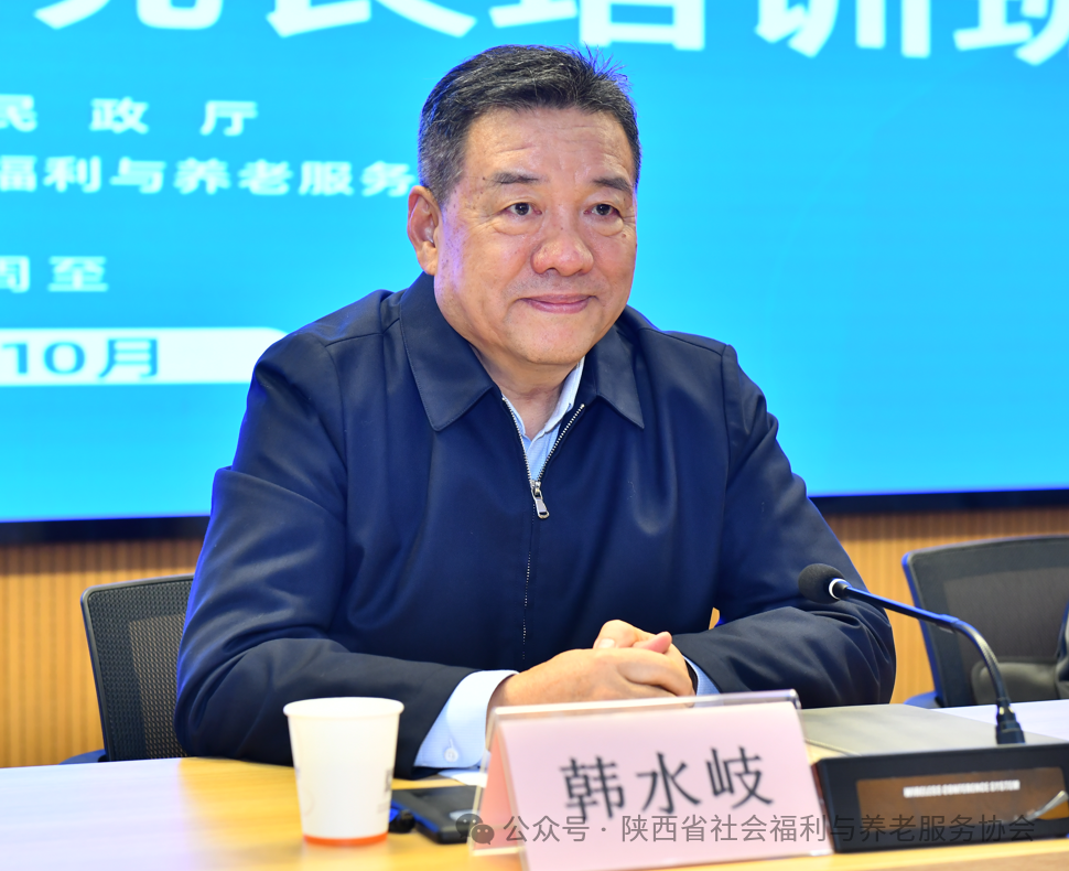随后,省福协会长韩水岐致辞。他指出,这次培训班,是在省民政厅的大力支持下,省福协在特殊时间节点、面向特殊对象,举办的一次具有特殊意义的培训班。一是从时间节点看,本次培训班是在深入学习贯彻党的二十届三中全会精神之际举办的。二是从培训对象看,这次培训班是面向全省养老服务行业的“关键少数”举办的。三是从培训内容看,这次培训是聚焦养老主业而“量身定作”的。他强调,养老院院长在养老事业中发挥着关键作用,是国家和社会大爱的传递者,是全省养老机构具有“火车头”性质的“关键少数”,是全省养老行业最可爱的人。养老院院长的专业素养、管理能力、奉献精神,直接关系到全省养老机构的服务质量,直接关系到老年人的晚年生活幸福,也直接关系到所在养老机构的荣与衰。此次培训旨在提升院长们的专业素养、管理能力以及对养老新理念的认知,以更好地应对日益增长的养老服务需求。最后,韩水岐会长借用习近平总书记的话作为开班式的结束语:“中国共产党人依靠学习走到今天,也必然要依靠学习走向未来!”作为全省养老服务机构的“领头雁”---各位养老院院长,要昂首新时代、奋进新征程,就必须依靠学习成就更好的自己、创造更好的未来。