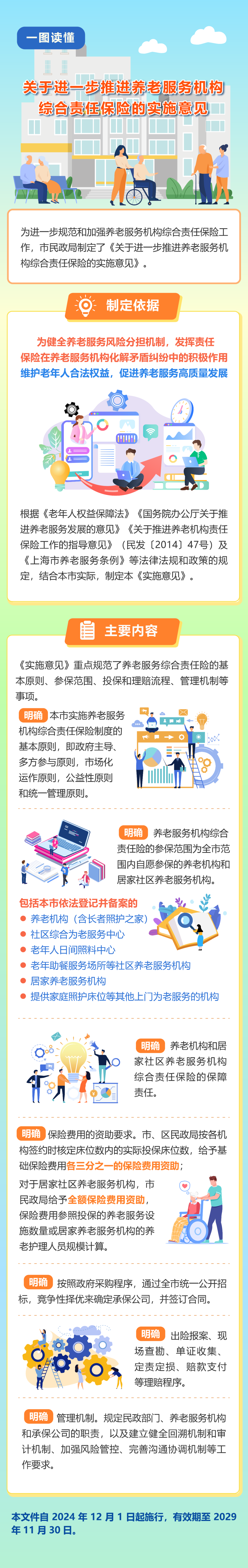 维护老年人合法权益是各级党委政府和社会各界广泛关心的重要工作。为了健全养老服务风险分担机制,发挥责任保险在养老服务机构化解矛盾纠纷中的积极作用,根据《老年人权益保障法》、民政部《关于推进养老机构责任保险工作的指导意见》以及《上海市养老服务条例》等文件精神,结合本市工作实际,上海市民政局出台了《关于进一步推进养老服务机构综合责任保险的实施意见》。详见↓