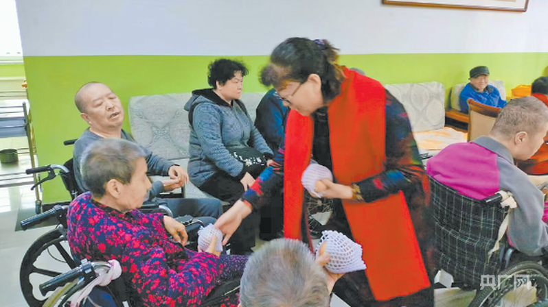 退休教师赵俊梅(右一)与博爱公益团队来到养老院与老人一起过重阳节