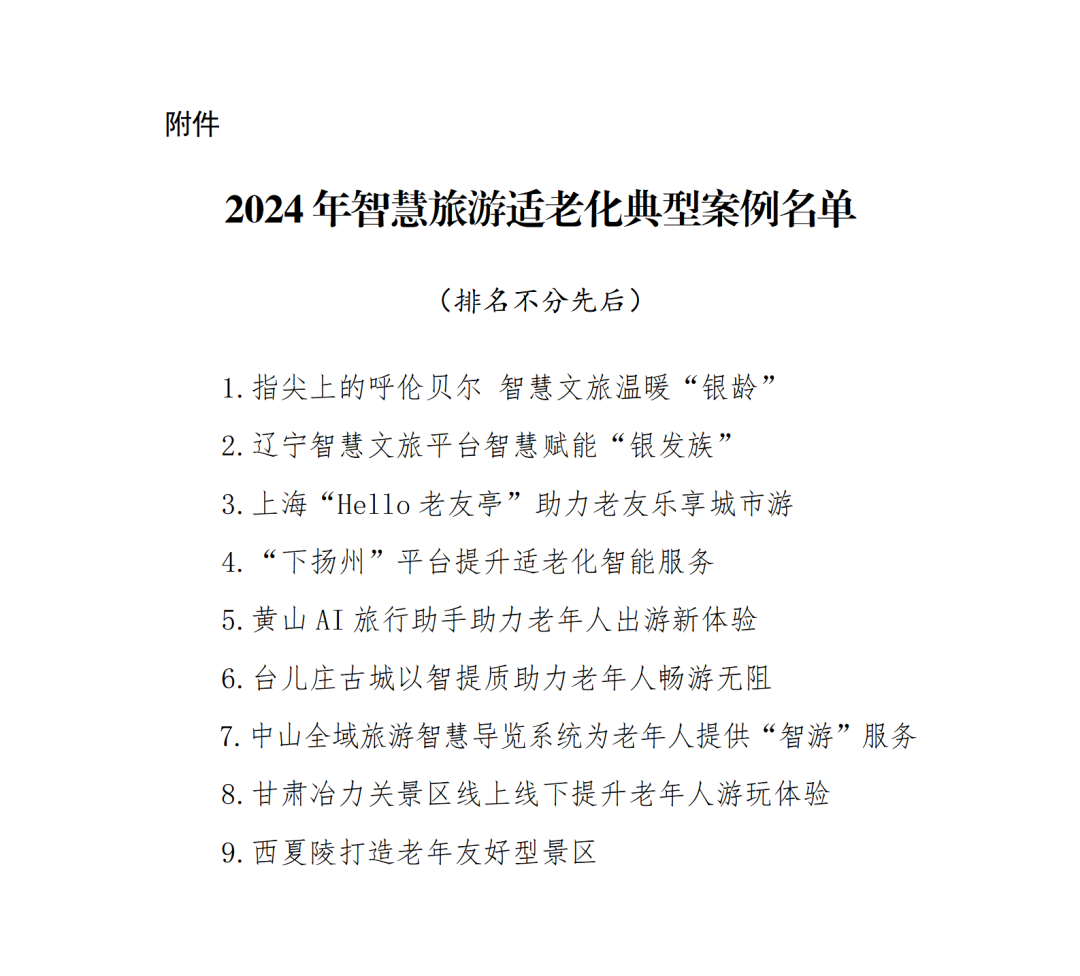 各省、自治区、直辖市文化和旅游厅(局)、工业和信息化主管部门、通信管理局、民政厅(局),新疆生产建设兵团文化体育广电和旅游局、工业和信息化局、民政局:为贯彻落实党的二十届三中全会精神,实施积极应对人口老龄化国家战略,落实《国务院办公厅关于发展银发经济增进老年人福祉的意见》(国办发〔2024〕1号),按照文化和旅游部、中央网信办等5部门联合印发的《智慧旅游创新发展行动计划》关于“定期遴选发布一批智慧旅游适老化案例,强化示范引导作用”的部署安排,切实解决老年人旅游过程中运用智能技术困难,文化和旅游部、工业和信息化部、民政部共同遴选出2024年智慧旅游适老化典型案例9个,现予公布(名单见附件)。典型案例详情将通过中国旅游报等媒体和渠道向社会宣传公布。希望各地文化和旅游、工业和信息化、通信管理、民政系统认真学习借鉴典型案例的好经验、好模式、好做法,充分发挥典型案例的示范引导作用,持续弥合“数字鸿沟”,让广大老年人共享旅游发展成果。附件: