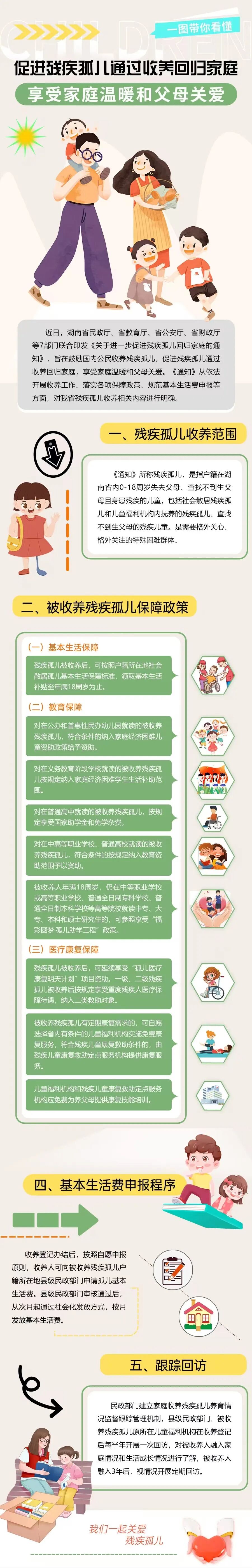 各市州民政局、教育局、公安局、财政局、卫生健康委、医保局、残联:残疾孤儿是指失去父母、查找不到生父母且身患残疾的儿童,包括社会散居残疾孤儿和儿童福利机构内抚养的残疾孤儿、查找不到生父母的残疾儿童,是需要格外关心、格外关注的特殊困难群体。家庭是残疾孤儿成长的最佳环境,依法收养是残疾孤儿回归家庭的主要渠道,帮助残疾孤儿回归家庭能够更好保障残疾孤儿成长。为贯彻落实《民政部?教育部?公安部?财政部?国家卫生健康委?国家医保局?中国残联关于进一步促进残疾孤儿回归家庭的通知》(民发〔2024〕6号)精神,切实维护残疾孤儿合法权益,现就有关事项通知如下。(一)做好送养前筛查摸底。各级民政部门要加强对所属儿童福利机构送养残疾孤儿工作的监督和指导,定期对儿童福利机构残疾孤儿进行排查,做到底数清、情况明。儿童福利机构要把促进机构内残疾孤儿回归家庭作为工作重点,及时为残疾儿童办理《中华人民共和国残疾人证》(以下简称《残疾人证》)。要结合残疾孤儿日常体检报告和生长发育等情况,认真筛选可送养儿童,将符合送养条件的列入拟送养名单,细化完善残疾孤儿残疾状况、医疗康复情况、后续康复治疗建议等重要信息,结合儿童年龄、个人意愿等因素,选择适合的收养人,做到能送早送,让更多残疾孤儿享受家庭温暖。(二)规范开展收养工作。各级民政部门要按照国家和省级收养评估工作要求开展收养评估、办理收养登记,保障被收养残疾孤儿和收养人合法权益。认真评估收养家庭收养动机、道德品行、融合情况等内容。收养评估报告要归入收养档案,作为收养登记机关审核收养申请人是否具备收养条件的参考依据。收养评估合格、符合条件的,依法办理收养登记。残疾孤儿被收养后,养父母与养子女之间的权利义务关系适用《中华人民共和国民法典》关于父母子女关系的规定。(三)及时办理户口迁移手续。被收养残疾孤儿需办理户口迁移手续的,收养人应当按照有关规定向公安机关提出申请,由公安机关依法办理。收养人依据法律法规提出保守收养秘密申请的,公安机关可以在居民户口簿上将收养人与被收养人关系登记为父母子女关系。对我省户籍被收养的残疾孤儿(以下简称“被收养残疾孤儿”),给予相应的基本生活、教育和医疗康复等保障。(一)继续保障基本生活。残疾孤儿被收养后,经向被收养人户籍所在地县级民政部门申请,可以继续享受孤儿基本生活保障。县级民政部门核实后,按照本地社会散居孤儿基本生活保障标准发放孤儿基本生活费,基本生活费不计入残疾孤儿所在家庭收入。跨区域户口迁移的,收养人应当及时向迁入地民政部门提出孤儿基本生活费发放申请,并同步告知迁出地民政部门。迁出地、迁入地民政部门要做好基本生活费发放衔接,避免出现漏发或重复发放的情况。被收养人年满18周岁、死亡、残疾康复或者申请不再领取的,应及时停发。各地民政部门应当规范基本生活费发放管理,防止出现虚报冒领、截留挪用等情况,同时应当建立基本生活费发放档案管理制度,确保全部资料建档备查。(二)纳入教育保障范围。各地教育部门应当将符合条件的被收养残疾孤儿纳入当地教育资助政策范围,根据实际安置就近入园入学。对在公办和普惠性民办幼儿园就读的被收养残疾孤儿,符合条件的纳入家庭经济困难儿童资助政策给予资助;对在义务教育阶段学校就读的被收养残疾孤儿按规定纳入家庭经济困难学生生活补助范围;对在普通高中就读的被收养残疾孤儿,按规定享受国家助学金和免学杂费;对在中高等职业学校、普通高校就读的被收养残疾孤儿,符合条件的按规定纳入教育资助范围予以资助。被收养人年满18周岁,仍在中等职业学校或高等职业学校、普通全日制专科学校、普通全日制本科学校等高等院校就读中专、大专、本科和硕士研究生的,可参照享受“福彩圆梦·孤儿助学工程”政策。(三)延续享受救助政策。各地卫生健康、医保、残联等部门,应当按规定落实好被收养残疾孤儿在医疗卫生机构就诊服务、医疗保障和康复救助等政策,统筹发挥好基本医保、大病保险、医疗救助的作用。残疾孤儿被收养后可延续纳入“孤儿医疗康复明天计划”项目资助,一级、二级残疾孤儿被收养后按规定享受重度残疾人医疗保障待遇,纳入二类救助对象。被收养残疾孤儿需要定期康复的,收养家庭可以自愿选择省内有条件的儿童福利机构实施免费康复服务,符合残疾儿童康复救助条件的,由残疾儿童康复救助定点服务机构提供康复服务。儿童福利机构和残疾儿童康复救助定点服务机构应免费为养父母提供康复技能培训。符合条件的被收养残疾孤儿,也可按规定享受社会救助或残疾人保障相关待遇,但应做好各项政策衔接,避免重复享受。(一)申请。收养登记办结后,按照自愿申报原则,收养人可向被收养残疾孤儿户籍所在地县级民政部门申请孤儿基本生活费。申请时,需提供以下材料:1.《湖南省被收养残疾孤儿继续领取孤儿基本生活费申请登记表》(附件1);3.收养人身份证、户口簿原件,被收养残疾孤儿户口簿原件;以上材料民政部门应复印存档。对申报材料不全的,民政部门应当一次性告知收养人申报所需材料,必要时协助收养人完善申报材料。(二)审批。被收养残疾孤儿户籍